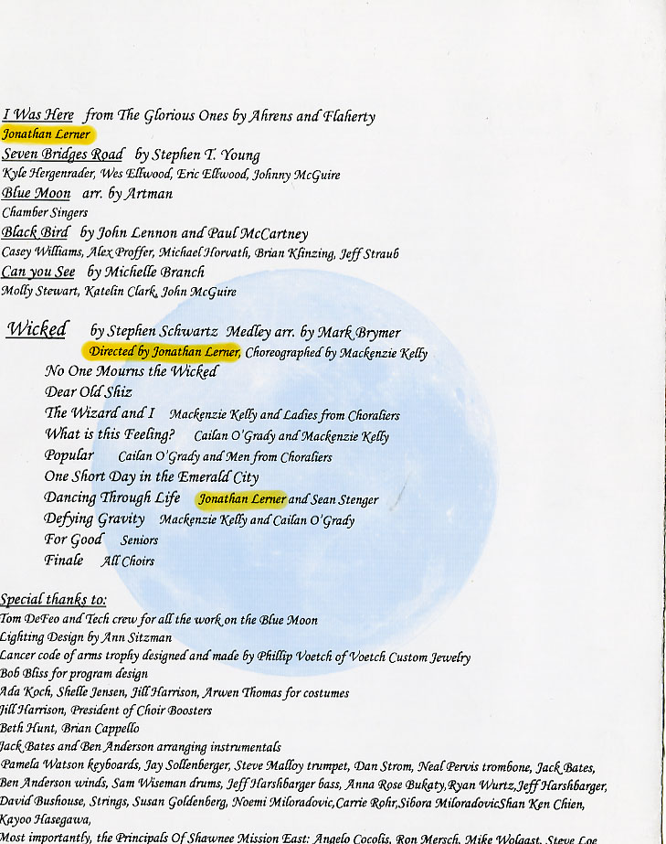 In the Spring of 2006, I was given the opportunity to serve as student director, choreographer, musical director and performer in an enormous musical production entitled BLUE MOON. Ultimately the entire production consisted of over 370 students from Shawnee Mission East High School, in Prairie Village, Kansas. Below, you will find links to the different pages of the show's program. Highlighted are my various contributions to the production.